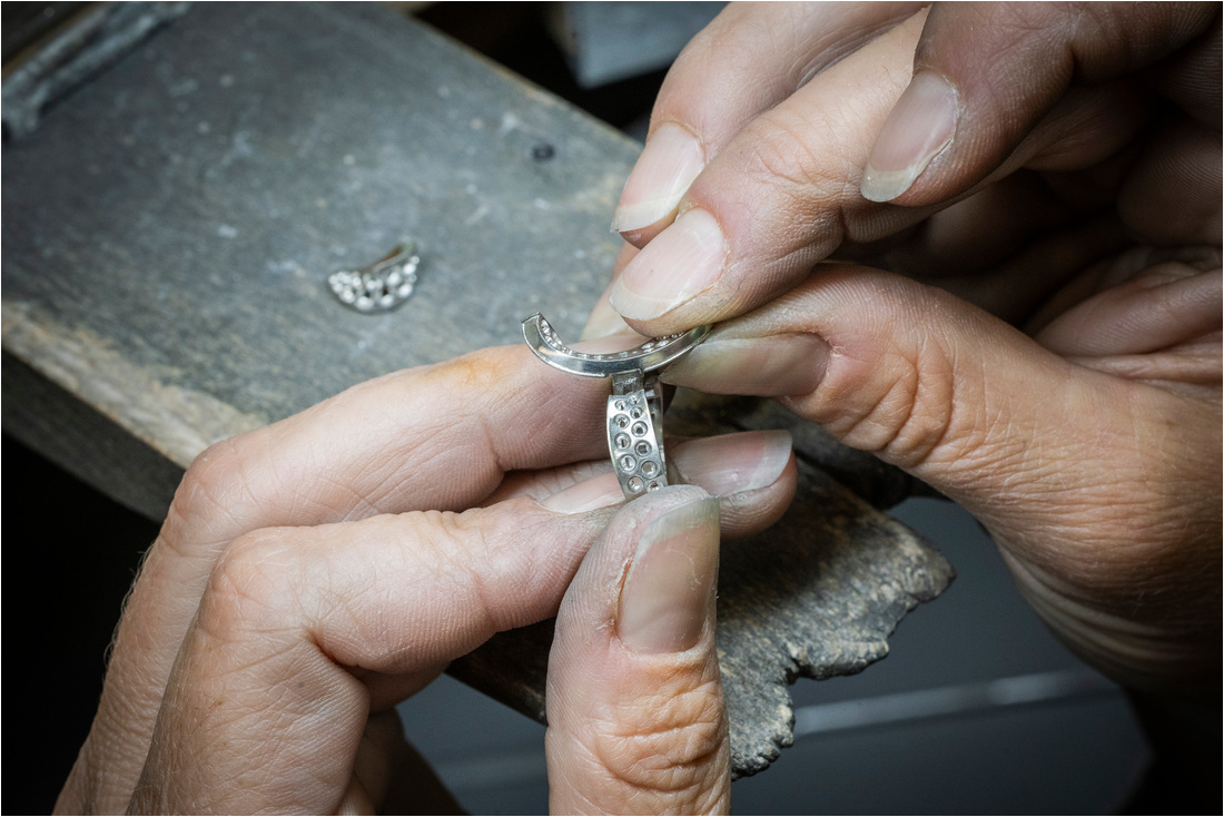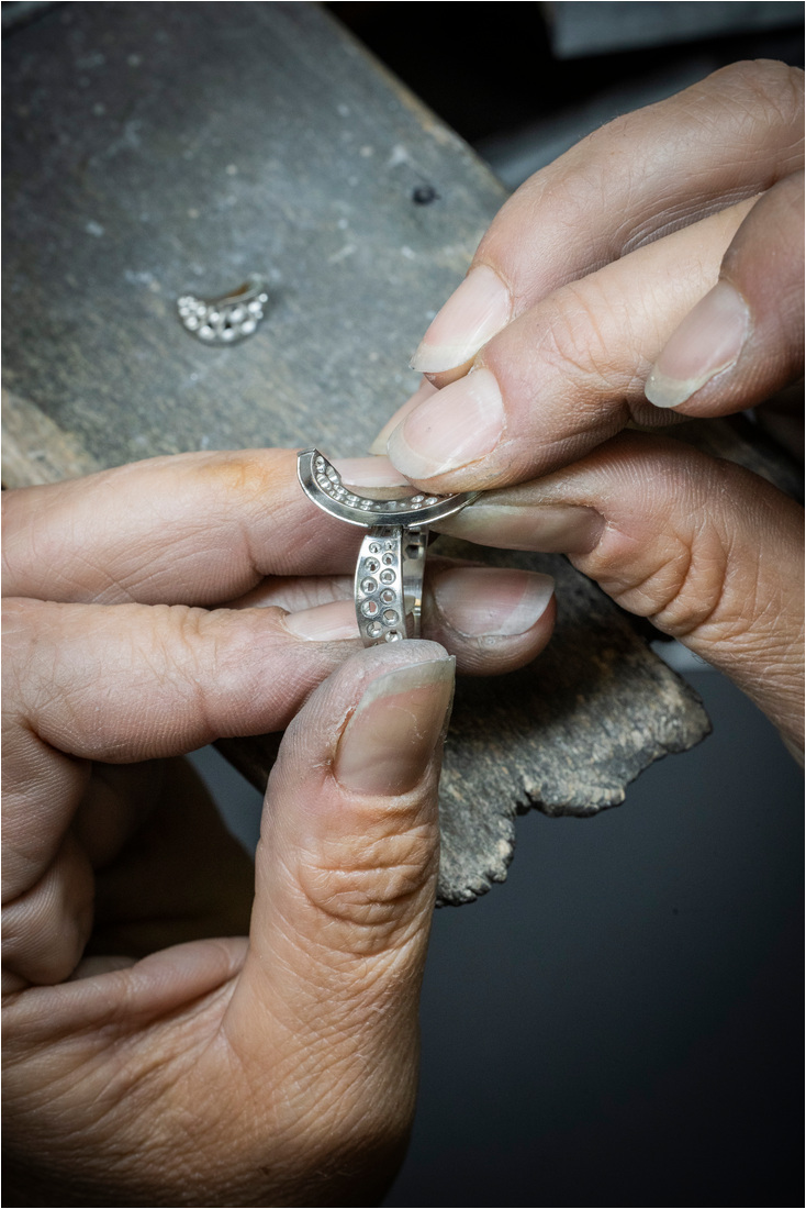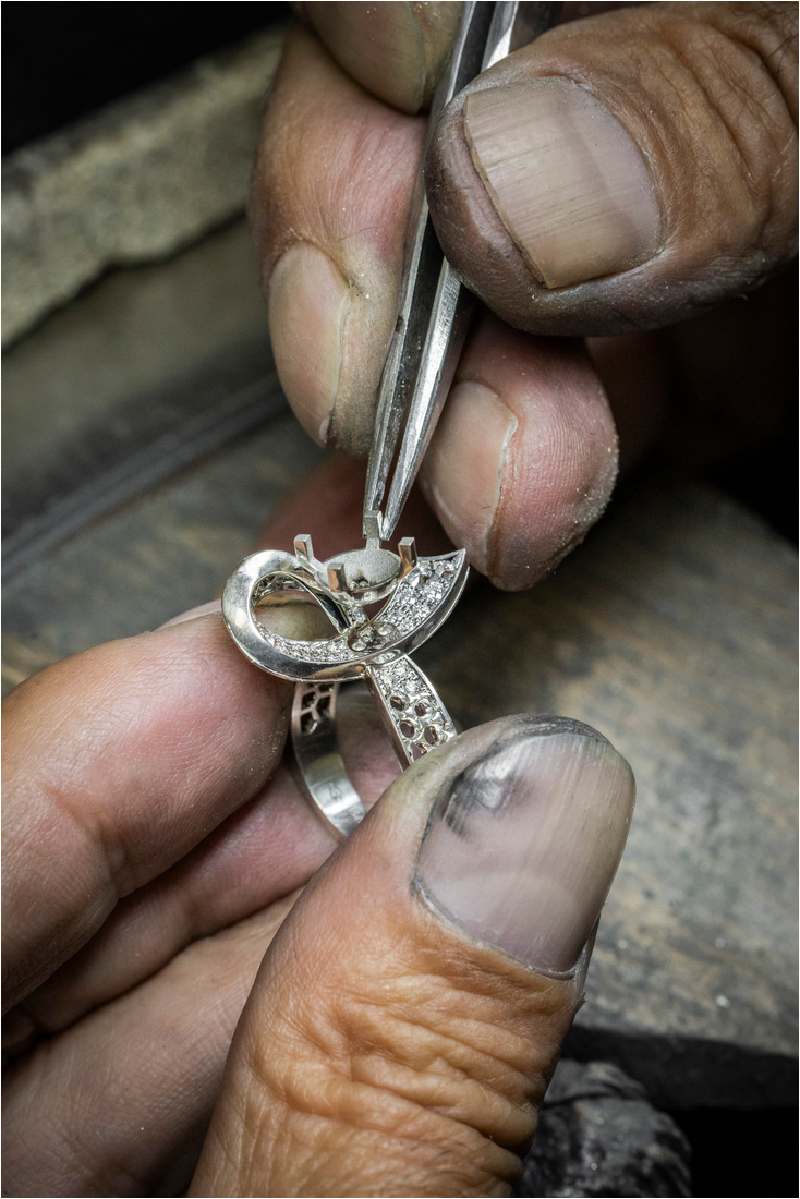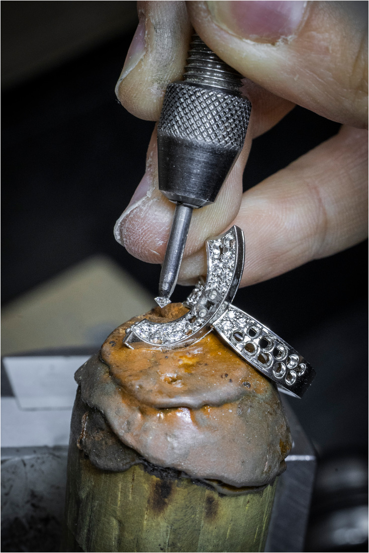La producción comienza en el joyero cuando se hace el oro y se dan forma a las curvas del diseño. Luego se construyen los engastes que contendrán las piedras y se preparan las superficies para recibir los diamantes.
