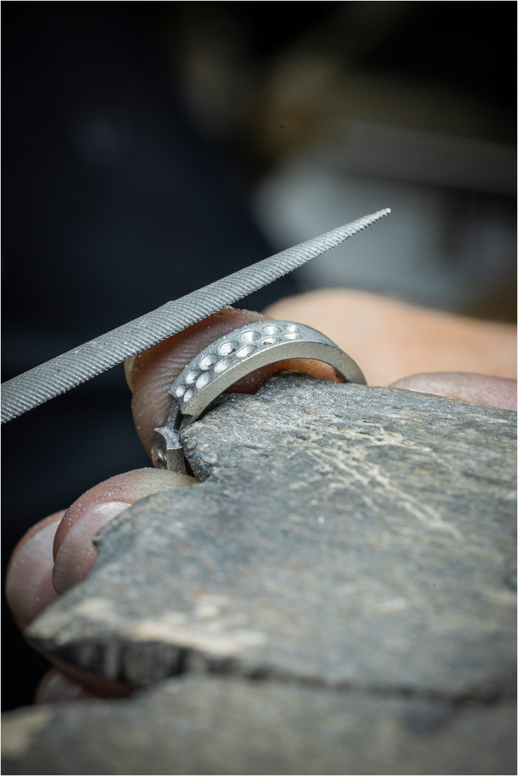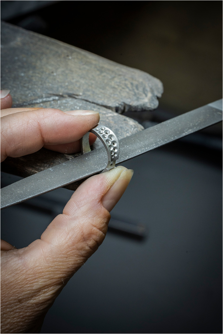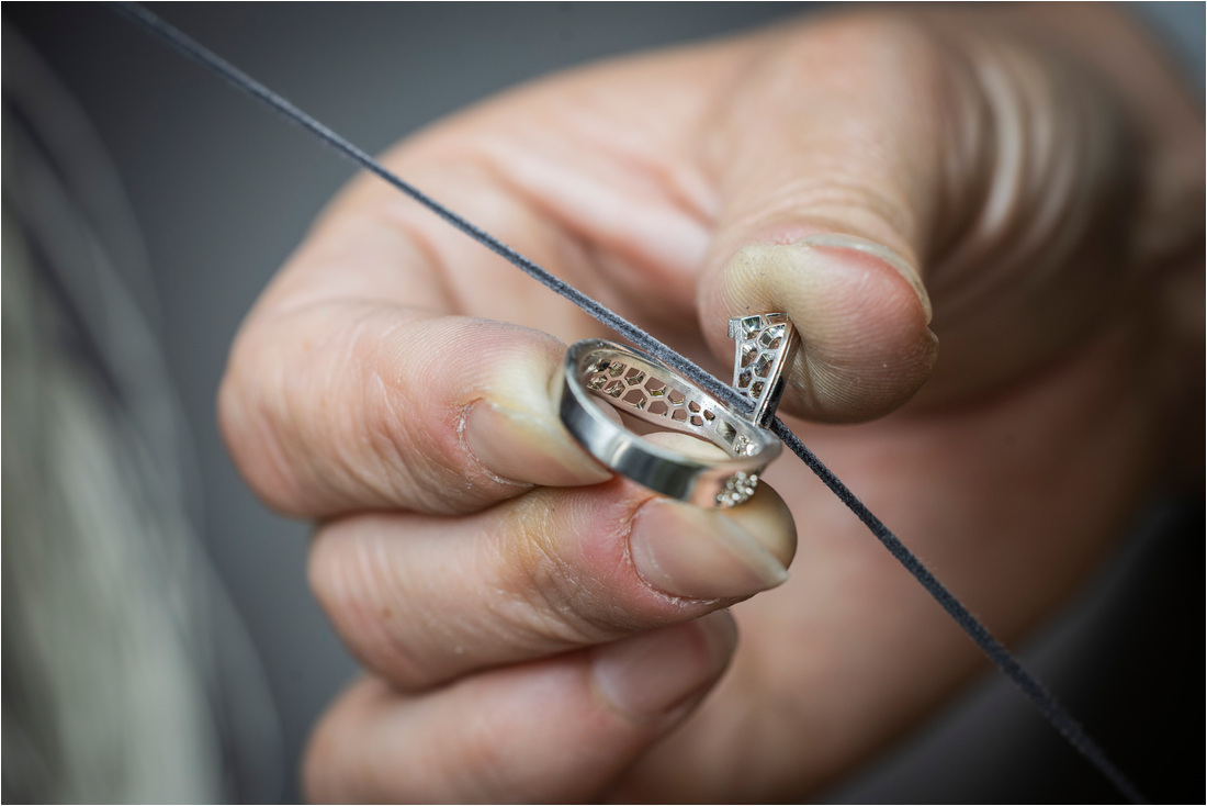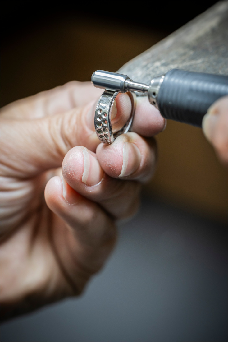 La producción comienza en el joyero cuando se hace el oro y se dan forma a las curvas del diseño. Luego se construyen los engastes que contendrán las piedras y se preparan las superficies para recibir los diamantes.
