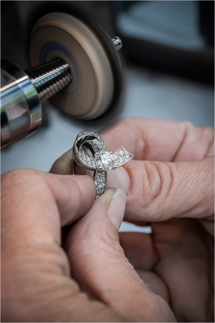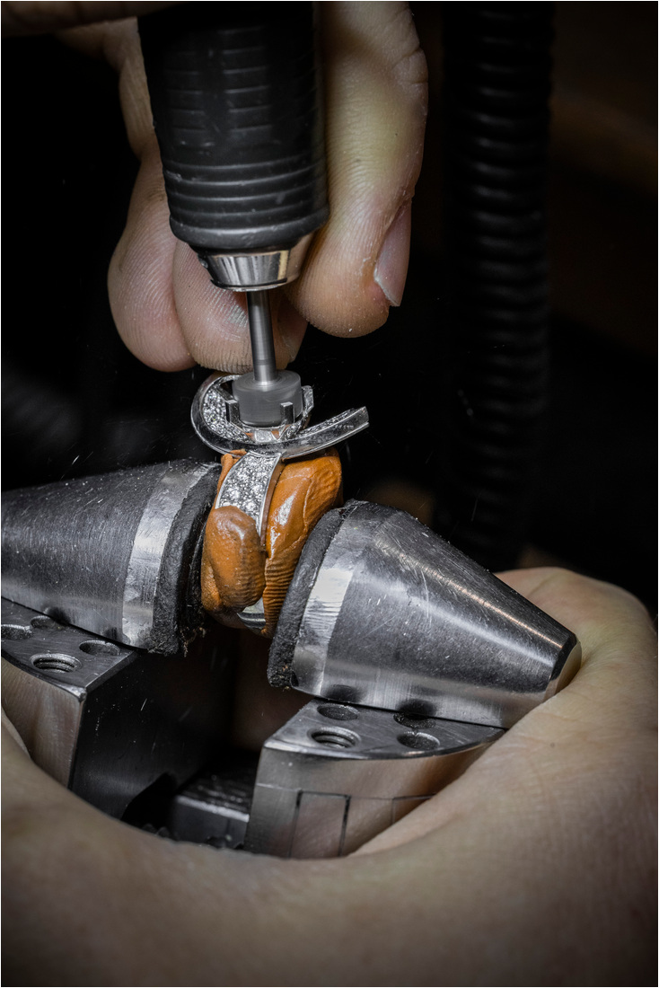 El pulido del metal no es menos meticuloso. El pulido se aplica utilizando diversas herramientas y pinceles pintados a mano para mostrar el color del oro mientras cada diamante se coloca en su lugar.